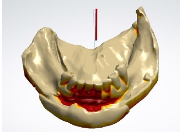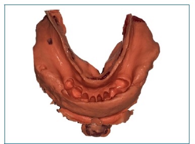 After the dental preparations, a definitive impression was performed with the customized tray in alginate (Turboprint, R&S), as well as a preliminary registration with wax occlusal rim (Metrowax) (Figure 2). This impression was poured (Type III, Ventura Stone, Madespa) to obtain the master cast. The master casts were then scanned (D700 3D scanner, 3shape, Denmark), and the metal framework was digitally drawn (Phibo developed by 3shape, Barcelona). The software used has tools similar to those of physical sculpting and enables working in a manner that mimics that of the conventional technician working in the laboratory, finding the best insertion path (Figure 3). The design used in this case is shown in Figure 4.