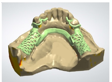 The next step included building the RPD framework on the SLM machine (EOS GmbH, Phibo, Barcelona) with a cobalt‑chromium alloy powder. Firstly, adequate supports had to be created to provide a firm base for the part to be built onto while separating it from the substrate plate. Because the supports need to be removed with tools, the part was oriented so that the supports avoided the RPD’s fitting surface and, thus, the resultant framework would not be affected or damaged by the supports or their removal.8 The framework was finished and polished using traditional dental laboratory procedures.