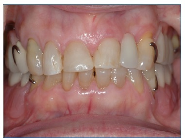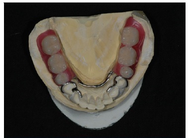 Subsequently, the intraoral metal framework try‑in was performed. The framework proved to have an excellent fit in the patient’s cast (Figure 5). When tested intraorally, the framework was passive and stable, adapted well to hard and soft tissues, and no occlusal adjustments were necessary. The wax occlusal rim (Metrowax) was placed on the edentulous regions of the framework, and an interocclusal record was made. Both maxillary and mandibular casts were mounted on an articulator (Asa, 5010), and artificial teeth (Stein Vit, New Stetic) were arranged (Figure 6). After the try‑in, the RPD was processed with heat‑curing acrylic resin (Probase Hot, Ivoclar Vivadent) and delivered to the patient with proper care instructions (Figures 7, 8, 9 and 10). At the post‑insertion appointment, the patient did not have any complaints regarding the prosthetic adaptation. The clinical case had a follow‑up of 2 years, during which the patient was checked every 6 months with oral hygienist and dentist control appointments, including observation of oral soft and hard tissues, teeth, and prosthetic rehabilitation.