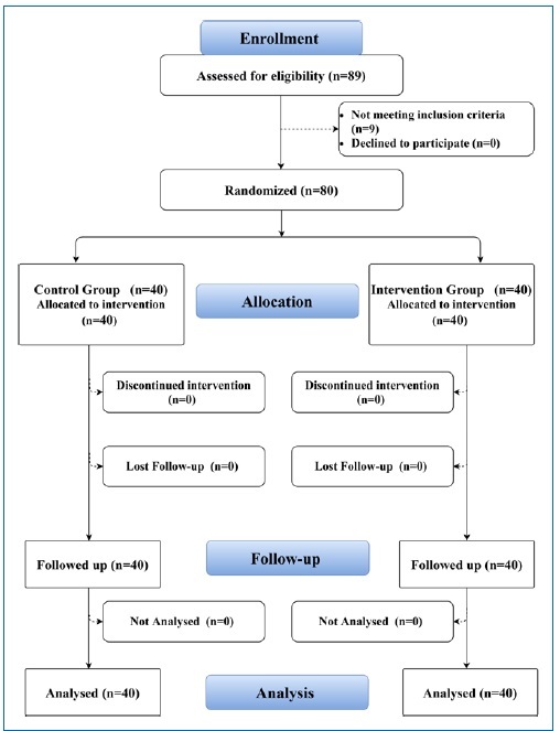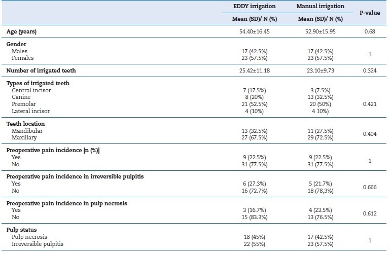 A total of 89 patients were assessed for eligibility to be included in this study. Out of those, 80 patients were randomly assigned to EDDY or manual groups. The mean age of the included patients was 54.40±16.45 and 52.90±15.95 in EDDY and manual groups, respectively (p=0.68). There was no statistically significant difference between both groups regarding the number of irrigated teeth (p=0.324), types of irrigated teeth (p=0.421), and teeth location (p=0.404) (Figure 1 and Table 1).