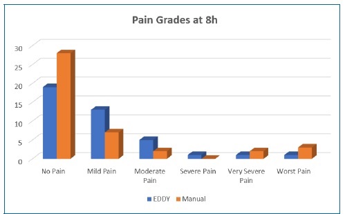 Figure 2 Bar chart showing the median levels of pain severity according to the visual analog scale between EDDY irrigation and manual irrigation groups at eight hours.