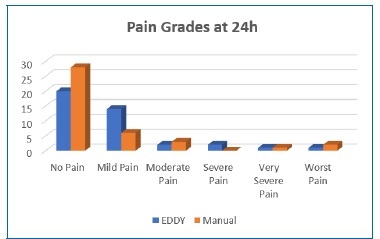 Figure 3 Bar chart showing the median levels of pain severity according to the visual analog scale between EDDY irrigation and manual irrigation groups at twenty-four hours.