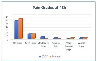 Figure 4 Bar chart showing the median levels of pain severity according to the visual analog scale between EDDY irrigation and manual irrigation groups at forty-eight hours.