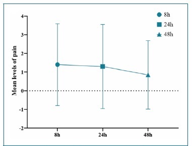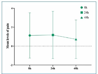 Figure 5 Line graph with error bars showing the mean levels of pain severity according to the visual analog scale at 8, 24, and 48 hours among patients who received EDDY irrigation.