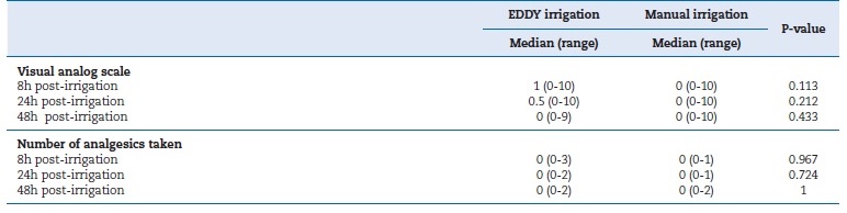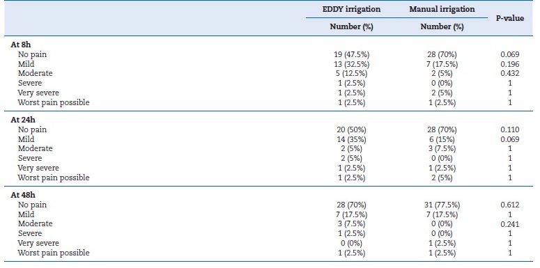 There was no statistically significant difference between both groups regarding the median pain levels 24 hours post-irrigation, with a median of 0 (0-3) and 0 (0-1), respectively. Post-irrigation pain occurred in 20 (50%) and 12 (30%) cases within EDDY and manual groups (p=0.068), respectively. The number of patients who experienced mild pain was 14 (35%) in the EDDY group and 6 (15%) in the manual group (p=0.069).