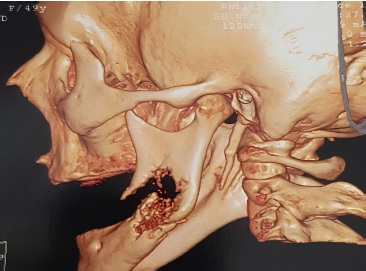 A 49-year-old white female patient was referred to the Oncology Service of the Santa Casa de Misericórdia Hospital in Ponta Grossa (Brazil) in March 2018 after a positive biopsy for a grade-II intraepithelial cervical neoplasia. There, she underwent a biopsy of the uterus cervix, and the lesion was diagnosed as a moderately differentiated invasive non-keratinizing squamous cell carcinoma. The treatment consisted of 28 sessions of radiotherapy and chemotherapy. After beginning tumor treatment, the patient reported painful symptoms in the left mandibular body region. In October 2018, the patient was referred to the Oral and Maxillofacial Service of the Santa Casa de Misericórdia of Ponta Grossa due to pain on the left side of the mandible. A periapical radiograph showed a radiolucent area in the region (Figure 1), and the tomographic examination revealed a pathologic fracture of the mandible. She was referred to the Oral and Maxillofacial Surgery and Traumatology sector of the Santa Casa de Misericórdia of Ponta Grossa, where a tomography of the region showed a large lesion in the left mandibular body (Figure 2). We chose the mandibular segmentary resection, with secondary biopsy, as surgical treatment because the mandibular basal cortical was compromised by the tumor (with a pathological fracture) and the patient had a history of a malignant tumor.