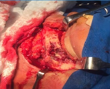 The periosteum of the entire area was exposed and detached, exposing the entire mandibular body. The lesion was in the mandibular body region, becoming visible at the end of the access. The left mandibular body was resected (Figure 3) with cutters, thus proceeding with tumor excision (Figure 4). The mandibular lesion underwent excisional biopsy, where three tissue samples were removed: one from the soft tissue of the mandible’s lateral surface, the second from mandibular boné tissue, and the third from the submandibular region. The pieces were placed in separate containers with 10% formalin and sent for histopathological examination. A 2.4-mm reconstruction plate system was fixated to restore the mandibular contour, and the skin was sutured with 5-0 nylon. The patient evolved without complications in the mandibular postoperative period.