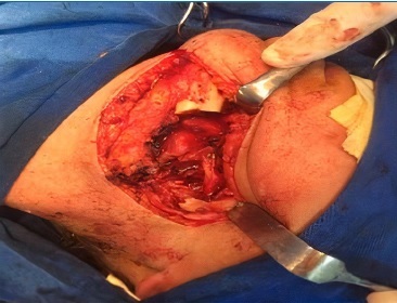 The surgery was performed under general anesthesia and nasotracheal intubation, with the patient in dorsal decubitus. Antibiotic prophylaxis was performed with Kefazol® (i.v. cefazolin 500mg) and Flagyl® (i.v. metronidazole 500 mg). Asepsis was performed on the left side with topical polyvinylpyrrolidone-iodine, followed by the apposition of sterile barriers.