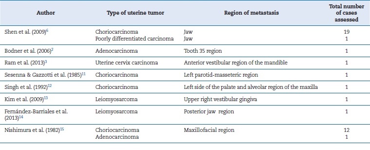 Few reports in the literature cite metastases from uterine tumors to the maxillofacial region. Table 1 shows the findings of uterus metastasis to the maxillofacial region, with an apparent prevalence of choriocarcinoma.2,3,6,11-15A study by Hirshberg et al.1 found tumors originating from the female genital organs (uterus, ovary, cervix, uterine tubes - without specification of each case) in 28 out of 169 patients. Of these, 17 tumors were metastatic in maxillary and mandibular bones and 11 in the oral mucosa.
