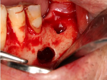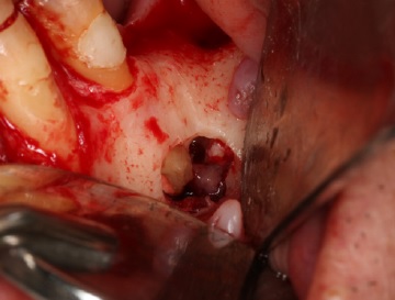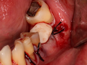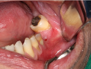Exame extraoral mostrou ausência de sinais de alterações patológicas. Exame intraoral mostrou ausência do dente 36 e fístula na região de rebordo alveolar, com drenagem de secreção purulenta (Figura 1).