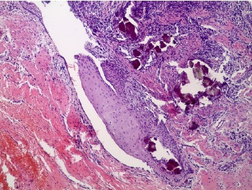 Figura 10 Fotomicrografia de corte histológico corado em hematoxilina e eosina, mostrando infiltrado inflamatório mononuclear e áreas de calcificação distrófica na cápsula cística, bem como seu revestimento por epitélio estratificado pavimentoso não ceratinizado - 100x.
