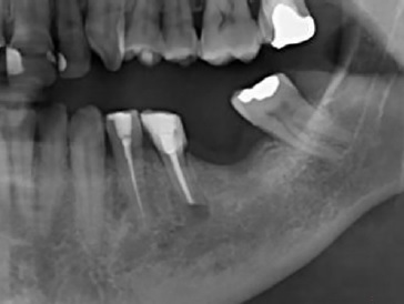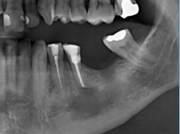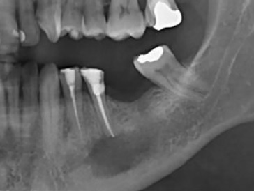 Paciente do sexo masculino, 52 anos, hipertenso e hipercolesterêmico, fazendo uso de Losartana e Atorvastatina, fumador há mais de 25 anos, foi encaminhado para avaliação de lesão em mandíbula do lado esquerdo. Durante anamnese, relatou ter feito tratamento endodôntico no dente 35 há 30 anos e, após sintomatologia dolorosa recente, foi submetido a retratamento endodôntico, porém sem alívio da dor. Em seguida, foi realizado também o tratamento endodôntico do dente 34, porém, após novo insucesso na regressão da lesão, paciente foi encaminhado para o Serviço de Cirurgia Oral e Estomatologia.