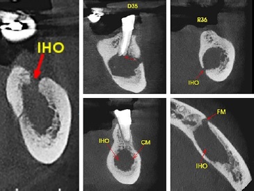 Figura 3 Cortes de tomografia computadorizada mostrando imagem hipodensa (IOH), na região periapical do dente 35 (D35) e região do dente 36 (R36) causando rompimento da face lingual da cortical do canal mandibular (CM) e das corticais ósseas vestibular e lingual da mandíbula, além de proximidade com o forame mentoniano (FM).