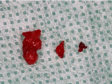 Figura 6 Fragmentos da lesão cística obtidos por biópsia incisional, enviados para exame anatomopatológico.
