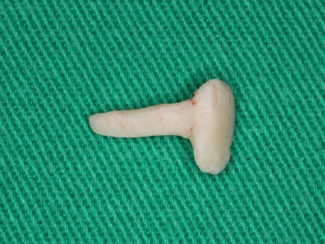 Foi realizada incisão e descolamento do retalho mucoperiósteo por vestibular, na região dos dentes 34, 35 e 36, expondo o trajeto fistuloso. Após osteotomia, realizada com broca esférica n.º 6, para acesso ao ápice radicular (Figura 4) e apicectomia do dente 35, utilizando broca troncocónica n.º 701 para peça reta (Figura 5), foi realizada coleta de fragmentos da lesão cística (Figura 6) e armazenamento em solução de formol a 10%, para exame anatomopatológico. Em seguida foi realizada a sutura para cooptação das bordas do retalho e instalação de um dispositivo de acrílico, removível, confecionado no momento da cirurgia, na região da fístula localizada na região do dente 36 (Figuras 7 e 8).