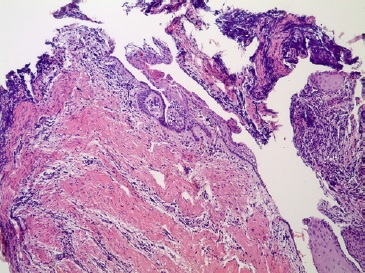 Figura 9 Fotomicrografia de corte histológico corado em hematoxilina e eosina, mostrando fragmento de cápsula cística revestida por epitélio estratificado pavimentoso não ceratinizado - 100x