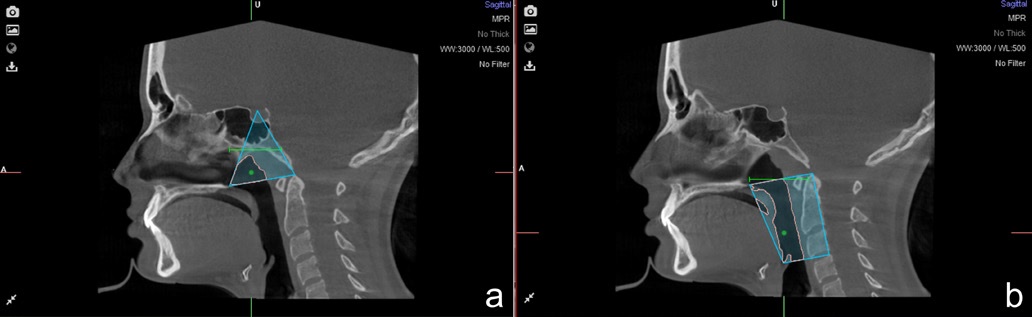 The limits of the nasopharynx and the oropharynx were determined for the upper airway assessment. The following landmarks were identified as the nasopharynx boundaries: (1) posterior nasal spine, (2) sella, and (3) the odontoid process tip, forming a triangle (Figure 2a). For the oropharynx, four anatomic points were identified: (1) posterior nasal spine, (2) epiglottis tip, (3) odontoid process tip, and (4) posterior superior border of the fourth cervical vertebra (Figure 2b). Afterward, the software calculated the corresponding volume in cubic centimeters (cm3) and the minimal sectional area in square millimeters (mm2). The sum of both nasopharynx and oropharynx volumes represented the total upper airway volume.
