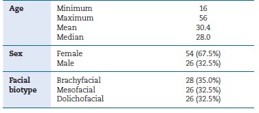 Our sample included 80 patients aged between 16 and 56 years, with a mean age of 30.4 years (SD=11.4) and a median age of 28.0 years (Table 1). Regarding gender, 54 (67.5%) were female and 26 (32.5%) male. Of the 80 patients, 28 (35.0%) had the brachyfacial type, 26 (32.5%) the mesofacial type, and 26 (32.5%) the dolichofacial type (Table 1). Table 2 presents the characterization of dentoskeletal, nasopharynx, and oropharynx variables.