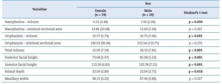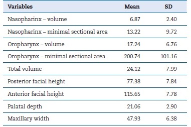 The Pearson correlation coefficient was used to determine the correlation between dentoskeletal variables and upper airway volume. A 5% significance level was set for the statistical tests’ results; i.e., differences and correlations were considered statistically significant when the significance value was lower than 0.50 (α=0.05).