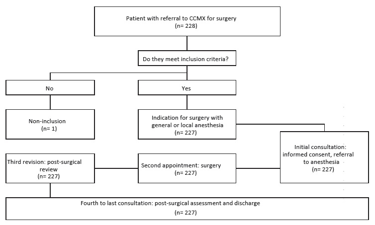 Odds ratios were reported with 95% confidence intervals. Statistical significance was set at 0.05 in all cases. All analyses were performed in STATA 17 (StataCorp. 2021. Stata Statistical Software: Release 17. College Station, TX: StataCorpLLC). Data from initial visits, surgery, first follow-up appointments, and discharge reports were collected for 192 children who underwent 227 procedures. One child was excluded for not meeting the inclusion criteria (Figure 1).