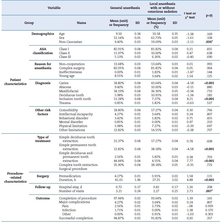 Demographics (Age: Mean age in years; Sex: Proportion of males in the group; Non-Caucasian: other non-Caucasian groups); Reason for anesthesia (Non-cooperation: reason for general anesthesia is lack of cooperation and young age; Complex surgery: reason for general anestesia is complexity of surgery; Ineffectiveness: ineffectiveness of local anesthesia: Young age: early childhood caries); Diagnosis (Deciduous tooth: persistence of deciduous teeth; dental inclusions: wisdom teeth and inclusions); Outcome of surgery (Completion: the case was completed; Successful completion: success in the procedure).