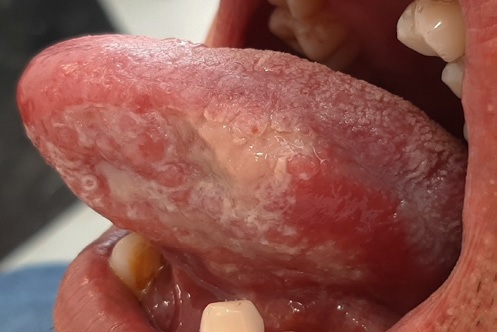 A 50-year-old man presented in a stomatologist’s office with painful ulcers in his tongue after one year and two months of evolution. Anamnesis revealed a history of psoriatic arthritis treated with adalimumab for five years. Two previous biopsies performed by another professional with a four-month interval did not demonstrate carcinoma but were otherwise inconclusive. The patient was diagnosed with glossitis caused by adalimumab.