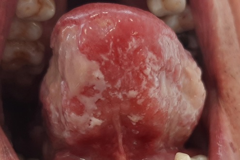 Figure 1 Irregular ulcers on the right border of the tongue extending to its dorsum and ventral region.