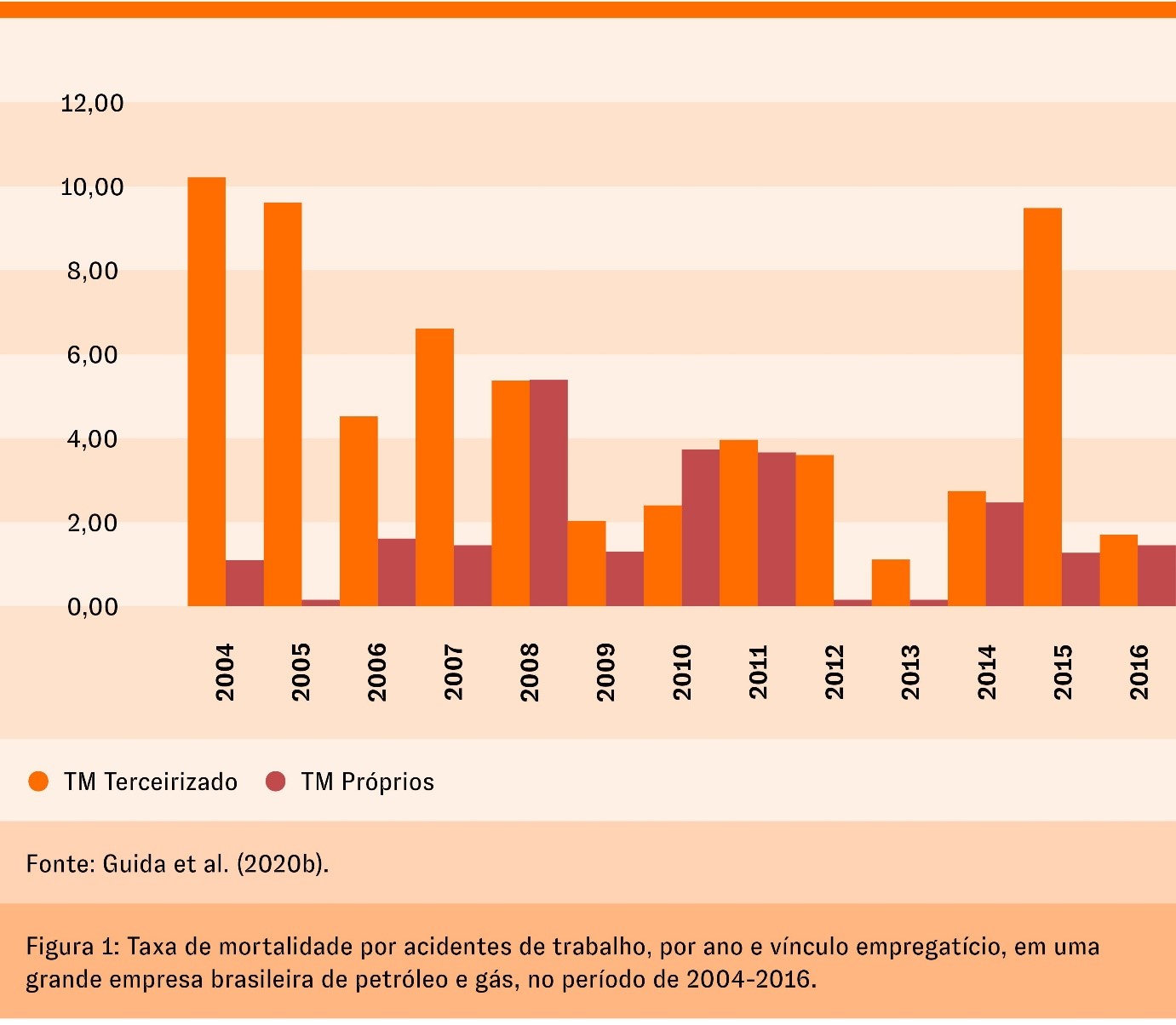 O caráter das consequências daí advindas parece reproduzir algumas das “velhas” tendências precarizantes do mundo do trabalho. Antes mesmo da reviravolta provocada pela Covid-19 - tema de extrema gravidade -, já estavam em andamento mudanças como a redução de efetivo operacional de forma pouco criteriosa em algumas unidades da Petrobras, o que tende a acarretar sobrecarga e intensificação do trabalho. E se, anteriormente, esta empresa já terceirizava determinadas atividades que, em nosso entendimento, poderiam ser consideradas atividades-fim, como a perfuração de poços, com a aprovação da Lei 13.429/2017 (Lei das Terceirizações) este problema deixou de existir. Por meio da nova regulamentação, abriu-se espaço para uma espécie de “terceirização sem limites”, sujeitando os trabalhadores a “mais precarização e riscos de morte” (Druck, 2016). Vejamos, por exemplo, o caso de uma grande empresa brasileira de petróleo e gás estudada por Guida et al. 2020a, Guida et al. 2020b). Se tomarmos como base a taxa de mortalidade de acidentes de trabalho, por ano e vínculo empregatício (trabalhadores terceirizados ou próprios), no período compreendido entre 2004 e 2016, pode-se constatar como o quadro é claramente desfavorável para os terceirizados (ver Figura 1).