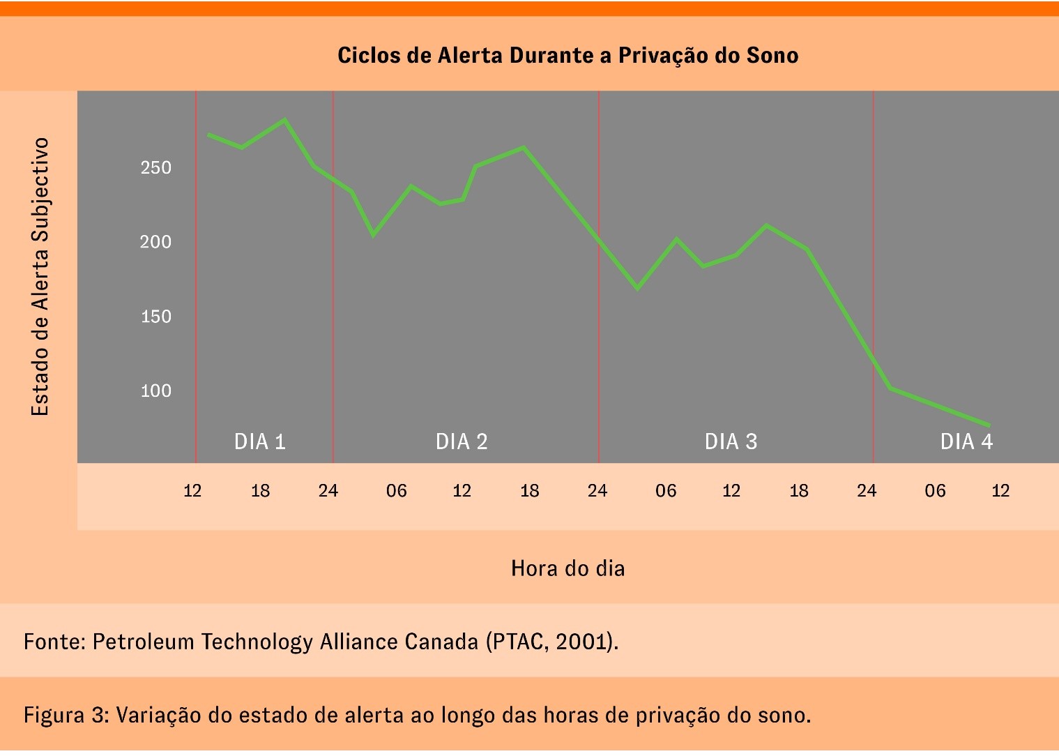 O esquema de trabalho prescrito para as equipes que atuam offshore compreende 14 dias embarcados, em que duas equipes se revezam em turnos de 12 horas, 7 dias no turno da manhã (7 h às 19 h) e os 7 restantes no turno da noite (19 h às 7 h). São fartamente documentados os riscos à saúde e segurança decorrentes do trabalho noturno, devido à adaptação do organismo ao sono noturno e vigília de dia (Alvarez et al., 2010). A fadiga resulta da falta de sincronia (o cérebro prepara o organismo para dormir, mas o trabalho demanda concentração total) e da privação acumulada de sono durante uma sequência de noites de trabalho (Ross, 2009). Como observam (Cohen et al. 2010), a perda crônica de sono reduz o desempenho, com possíveis consequências à saúde e segurança, já que a capacidade de sustentar a atenção é um recurso finito que diminui progressivamente ao longo das horas de vigília, o que leva a erros evitáveis, acidentes e lesões, especialmente em ambientes de alto risco (Rajaratnam et al., 2013).