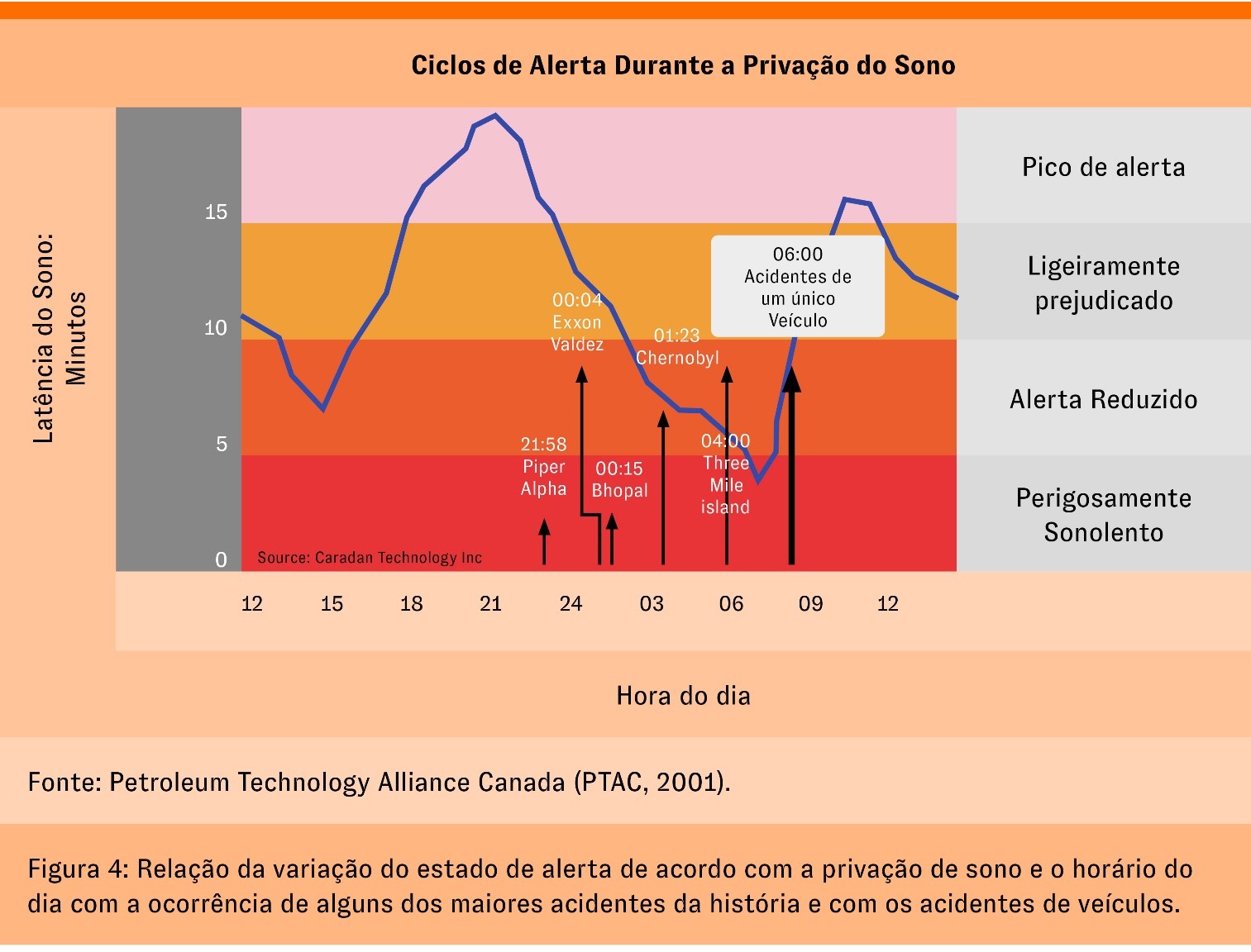 Figura 4 : Relação da variação dos estado de alerta de acordo com a privação de sono e o horário do dias com a ocorrência de alguns dos maiores acidentes da história e com os acidentes de trabalho