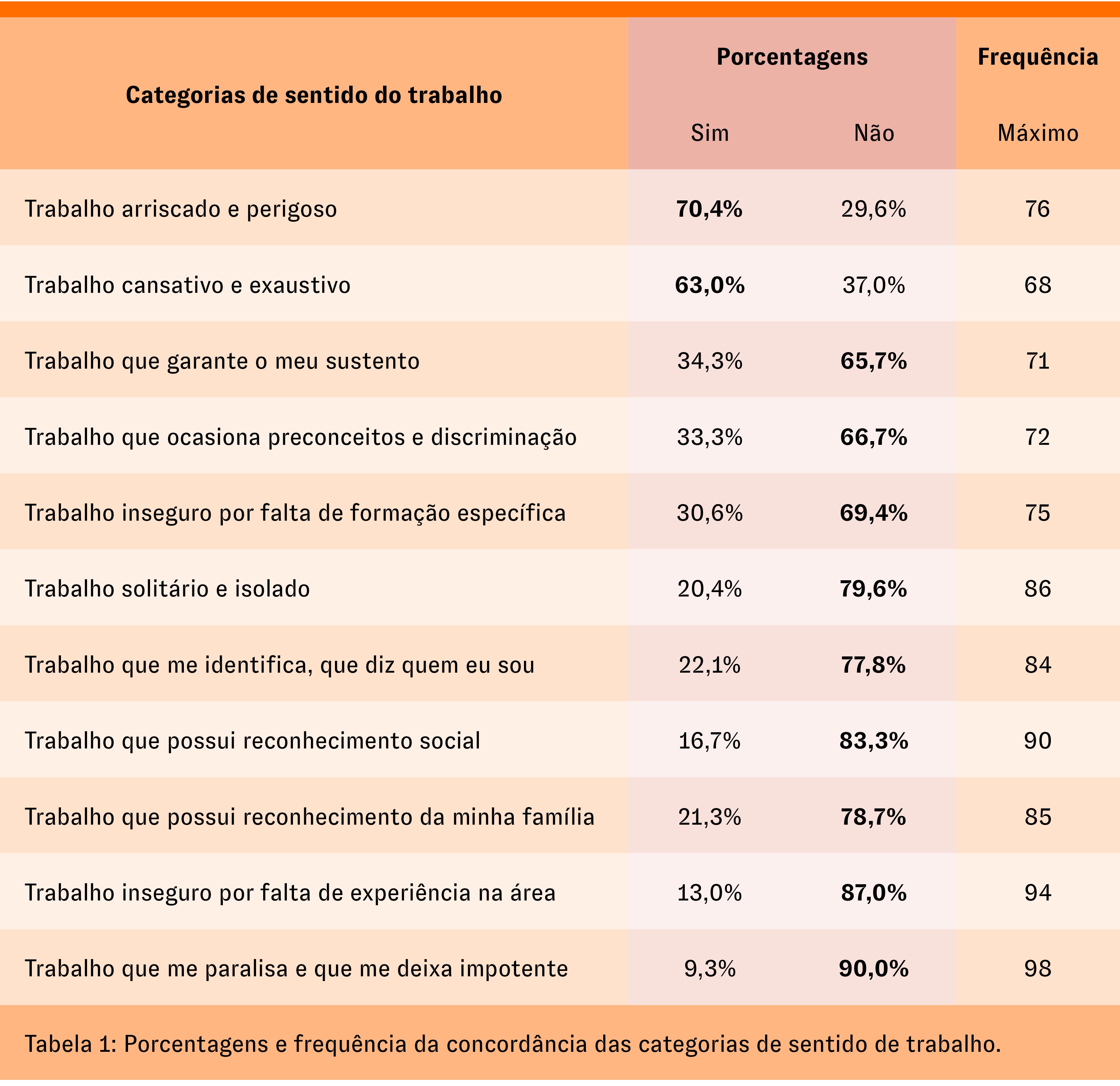 Observa-se ainda, a ênfase dada por parte dos profissionais referente aos aspectos monetários, como baixo salário e a falta de insalubridade para algumas categorias. Assim, identificou-se no estudo elementos da precarização do trabalho, que interferem diretamente no sentimento de reconhecimento, como pode ser observado nas categorias de sentido do trabalho na Tabela 1.
