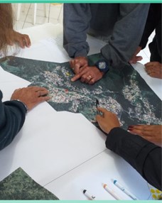 1ª Oficina: Apresentação do Mapa “Cru” do bairro em formato A0 gerado a partir de imagens do Google Earth. Reconhecimento territorial a partir da vista “de cima” e demarcações das principais vulnerabilidades das comunidades. Foram levados três mapas para que o conjunto de participantes se distribuíssem e se debruçassem sobre os mapas e compartilhassem seus saberes sobre o território. Após a sistematização dos registros realizados pelos moradores durante a oficina, em diálogo com alguns técnicos municipais presentes, os pesquisadores avaliavam as novas marcações e consolidavam essas informações na confecção de novos mapas para o encontro seguinte.