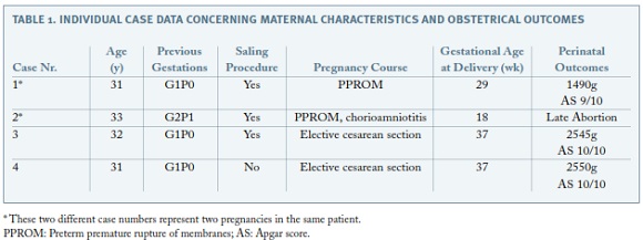 At early second trimester the cervix was measured by vaginal ultrasound, and the patients were submitted to a Saling procedure at 14 weeks of gestation if the cervix length was less than 15 mm. The Saling procedure was performed in another hospital in the same city, and consisted on removing part of the superficial epithelium of the cervix and proximal vagina and stitching it over the cervix obtaining a cervical occlusion in order to prevent infection. All Saling procedures were performed under loco-regional anesthesia. This procedure was performed in three pregnancies around the 14th week of gestation. Two of the procedures were performed in the same patient in consecutive pregnancies. In one patient this procedure was not considered necessary as the cervix length was 15 mm.