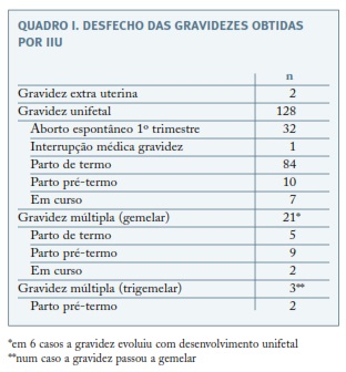 Das 152 gestações intrauterinas, 33 (21,7%) resultaram aborto espontâneo no primeiro trimestre (todos em gestações unifetais), 1 interrupção médica da gravidez por suspeita de displasia esquelética, 89 partos de termo (5 em gestações gemelares) e 21 partos pré-termo (9 gestações gemelares e 2 trigemelares) (Quadro I).