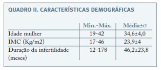 A duração média da infertilidade foi de 46 meses, tendo 492 (39%) ciclos sido realizados em casais que tentavam uma gravidez há pelo menos 48 meses. (Quadro II)