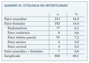 A etiologia da infertilidade foi fator masculino em 213 (16,9%) ciclos, fator feminino em 182 (14,4%), a combinação de ambos os fatores em 7 (0,6%) ciclos. Nos restantes 860 (68,1%) ciclos foi classificada com inexplicada. As causas femininas foram ainda discriminadas em fator tubário parcial em 91 (7,2%) casos, endometriose mínima a ligeira em 77 (6,1%), fator ovulatório em 8 (0,6%) e fator uterino em 6 (0,5%) casos, 2 após miomectomia, 3 casos pós-traqueletomia e 1 caso pós-conização cervical (Quadro III)