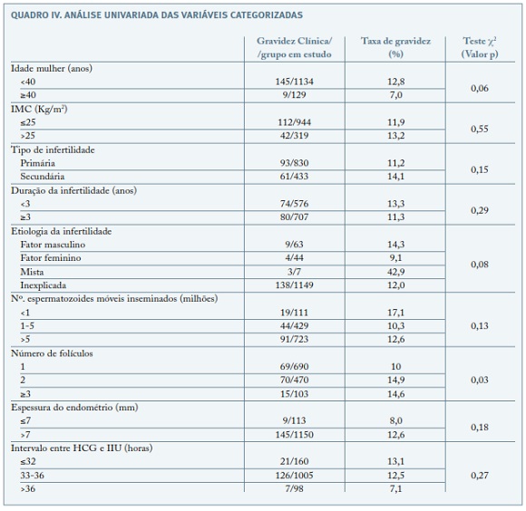 Separadamente foram avaliados os 150 casais que alcançaram uma gravidez intrauterina após IIU, tendo-se verificado uma taxa de gravidez superior quando a resposta à hiperestimulação foi multifolicular (66,9% vs. 51,5 %; p=0,02). Não se verificou uma associação entre o número de espermatozoides inseminados ou a espessura endometrial e a taxa de sucesso do procedimento.