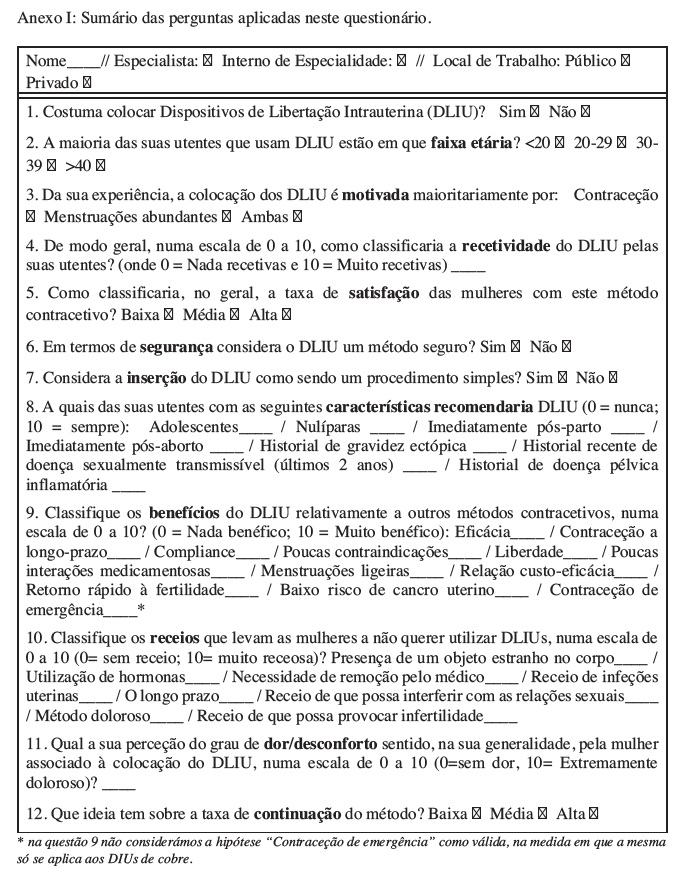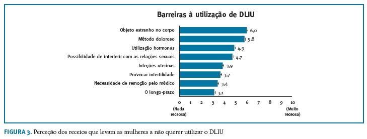 Alguns dos receios que possam levar as mulheres a não querer utilizar o DLIU foram sumarizados e foi solicitado aos clínicos participantes que, numa escala de 0 a 10 (em que 0= sem receio e 10=muito receosa), os classificassem de acordo com a perceção que tinham da experiência com as suas utentes. A lista dos 8 potenciais receios analisados inclui os seguintes itens: 1) presença de um objeto estranho no corpo, 2) utilização de hormonas, 3) necessidade de remoção pelo médico, 4) receio de infeções uterinas, 5) efeito contracetivo a longo-prazo, 6) receio de que possa interferir com as relações sexuais, 7) receio da dor na altura da colocação do DLIU e 8) receio de que possa provocar infertilidade. Os profissionais de saúde foram também questionados quanto à sua perceção face à recetividade do DLIU pelas utentes (onde 0= nada recetivas e 10= muito recetivas).