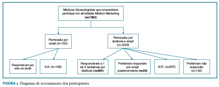 Os médicos que consentiram participar em atividades médico-marketing (n=1382) foram contactados entre 30 de julho e 10 de setembro de 2019. Numa primeira fase, o questionário foi enviado por email aos potenciais participantes. Aos clínicos que providenciaram um contacto telefónico e eletrónico foi dada preferência à aplicação do questionário telefonicamente, tendo o questionário sido enviado por email no caso de 3 tentativas de contacto infrutíferas via telefone (Figura 1).