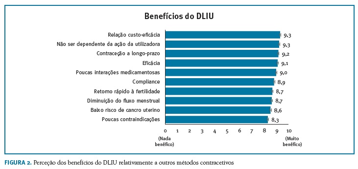 De uma lista de 10 possíveis benefícios que advêm do uso de DLIU relativamente a outros métodos contracetivos, foi-lhes solicitado que classificassem o grau de importância para cada um deles, numa escala de 0 a 10 (em que 0= nada benéfico e 10= muito benéfico). Os benefícios enumerados foram os seguintes: 1) eficácia, 2) contraceção a longo-prazo, 3) compliance, 4) poucas contraindicações, 5) não ser dependente da ação da utilizadora, 6) poucas interações medicamentosas, 7) diminuição do fluxo menstrual, 8) relação custo-eficácia, 9) retorno rápido à fertilidade e 10) diminuição do risco de cancro do endométrio.