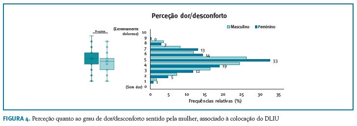 Foi ainda solicitado que, de uma escala de 0 a 10 (em que 0= sem dor e 10= extremamente doloroso) os clínicos classificassem a perceção que têm relativamente à dor/desconforto experienciado pelas utentes aquando da colocação do DLIU. Os dados extraídos sobre esta questão foram segregados por sexo do especialista que respondeu.