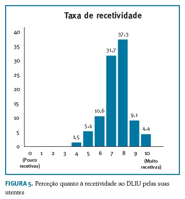 Sessenta e nove por cento dos clínicos (n= 333) classificaram a recetividade das utentes à colocação do DLIU entre 7 e 8 (onde 0= nada recetivas e 10= muito recetivas), sendo que nenhum clínico atribuiu uma classificação inferior a 4 (Figura 5).
