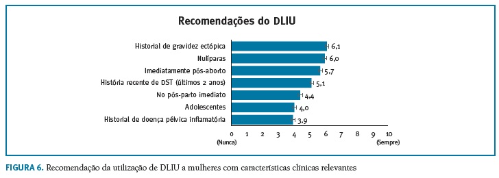 De entre as situações listadas na Figura 6, e numa escala de 0 a 10 (em que 0=nunca e 10= sempre), os médicos entrevistados recomendariam o DLIU a mulheres com antecedentes de gravidez ectópica (6,1), a nulíparas (6,0), no pós-parto imediato (5,7) e com antecedentes recentes de uma DST (5,1). Para as restantes situações particulares listadas, foi atribuída uma classificação inferior a 5.