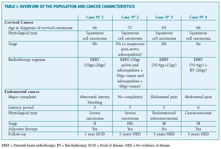 The databases of the Gynecology Department of the Instituto Português de Oncologia de Lisboa, Francisco Gentil E.P.E were searched for patients who had history of definitive radiation therapy for cervical carcinoma and subsequently developed an endometrial neoplasia. Four patients met our criteria. The authors then performed a retrospective analysis to obtain the details of the prior cervical cancer - age at diagnosis, histological type, stage and radiotherapy regimen used - latency period to the development of endometrial cancer and the details of the secondary neoplasia - histological type, stage, treatment and follow-up.