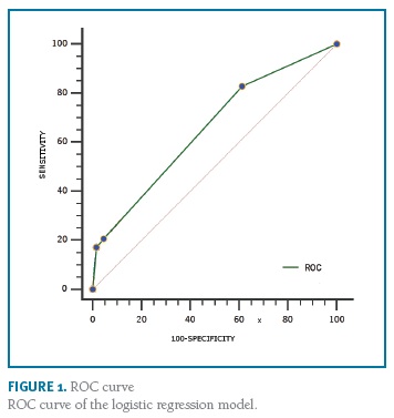 The ROC curve of the binary logistic regression model provided an adequate quality model adjustment (AUC= 0.70, SE= 0.053, p< 0.001, CI= 0.59 to 0.79). (Figure 1)