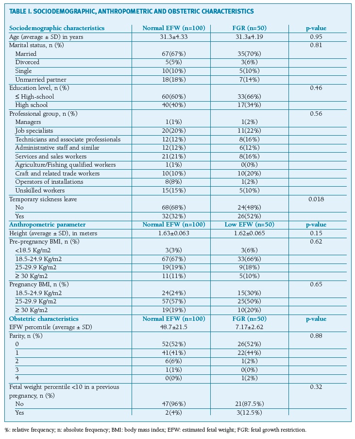 Study design and population: A case-control study was conducted. All professionally active pregnant woman that attended during 3rd trimester a pregnancy surveillance consultation at two Portuguese public hospitals during 4 months were included. The population was divided in two groups: FGR group - fetuses with estimated fetal weight (EFW) below the 10th percentile at 3rd trimester ultrasound; control group - fetuses with EFW equal to or higher than 10th percentile at 3rd trimester ultrasound.