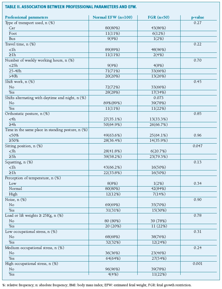 An observational, case-control study was developed. All professionally active pregnant woman that attended a pregnancy surveillance consultation during 3rd trimester at two portuguese public hospitals over the course of 4 months (between july and october 2016) were eligible. The population was divided in two groups: FGR group - fetuses with estimated fetal weight (EFW) below the 10th percentile at 3rd trimester ultrasound; control group - fetuses with EFW equal to or higher than 10th percentile. EFW was calculated with 4-parameter Hadlock formula, and percentiles were based on Yudkin et al. curves18-19. Exclusion criteria applied were: extremes of maternal age (less than 18 or more than 40 years of age), multiple pregnancy, exposure to teratogenic drugs, tobacco, alcohol or drug users, chronic or gestational hypertension, preeclampsia/eclampsia, previous diabetes, acquired thrombophilia, antiphospholipid syndrome, gestational body mass index inferior to 18,5 Kg/m2, previous diagnosis of malaria or TORCH group infections, chromosomal defects or incomplete information on clinical records. A questionnaire and the occupational stress questionnaire-general version (QSO-VG), developed and validated for Portuguese population, were applied to the target population20. The questionnaire was submitted as a pilot study with answers from 40 pregnant women. There were no suggestions of improvement. This instrument intended to obtain information about sociodemographic characteristics (date of birth, age, marital status, education, employment status), anthropometric data (pre-pregnancy weight, current weight and height), lifestyle during pregnancy and professional conditions. Regarding this, the evaluated conditions were: type of transport used to go to the work, travel time, number of weekly working hours, shift work, shifts alternating with daytime and night, posture (orthostatic posture, percentage of time in the same place in the standing posture, sitting, squatting), environmental conditions (perception of temperature, noise) and physical load (load or lift weights greater than or equal to 25 Kg). The QSO-VG evaluates 7 different categories of psychological stress: the relationship with users, managers or colleagues, work overload, concerns about the career and remuneration, family problems enhanced by occupation and working conditions. The application of the instruments occurred in a single contact with the subject, 10 minutes before the 3rd trimester pregnancy surveillance consultation. Additional information was collected through clinical records, including personal medical history and present and past obstetric data. The anonymity of participants and data confidentiality were guaranteed. The study was authorized by the Ethics Subcommittee for the Life Sciences and Health of University of Minho and by the Ethics Committees of both hospitals. The statistical analysis was performed using the Statistical Package for Social Sciences (SPSS) ®, Chicago, Illinois, USA, version 22.0. A descriptive analysis, with measures of central tendency and dispersion, appropriate to the variables, was initially performed. In the quantitative variables normality was analyzed using the Kolmogorov-Smirnov test and when this was significant (p <0.05), normality was assessed by asymmetry and the kurtosis of the histogram plot. The asymmetry reference values and kurtosis used were from -2 to +2. Then, it was assured that there were no statistically significant differences in the sociodemographic, obstetric and anthropometric characteristics between the two groups, by t-test for independent samples (age, height), chi-square test (educational level, temporary sickness leave, pregnancy BMI) or Fisher's exact test (marital status, professional group, pre-pregnancy BMI, parity, fetal weight percentile < 10 in a previous pregnancy) according to the different variables. Secondly, it was performed an univariate analysis that evaluated the association between “professional standards and EFW by chi-square test or Fisher's exact test. Finally, a multivariate analysis was done applying a binary logistic regression, by the Enter method, being the dependent variable “FGR” (present or absent). Independent variables were selected according to professional parameters that showed a statistically significant association with EFW in the univariate analysis and professional standards outlined in the current literature. The inclusion of the variables found in the literature was supported by comparing the ROC curves of two models: with or without these variables. The drawing and comparison of ROC curves was performed using MedCalc Software®. The significance level was set at 0.05, with a 95% confidence interval.