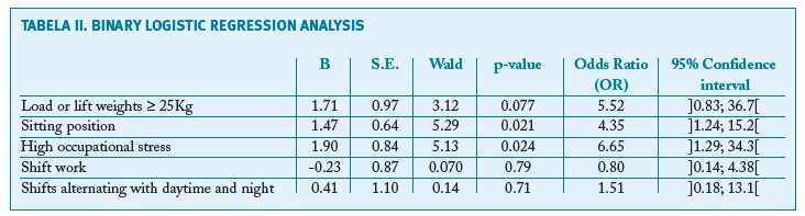 A binary logistic regression model was performed to evaluate the impact of professional standards in the probability of a pregnant woman to have a fetus with weight below the 10th percentile. Five independent variables were included - sitting position, high occupational stress, work by shifts, shifts with daytime and night rotation and load or lift weights greater than or equal to 25 Kg. In the selection of the independent variables were included the two variables that had a statistically significant association with EFW in the univariate analysis - sitting position and high occupational stress - and the professional standards outlined in the current literature - shift work, shifts with daytime and night switching and load or lift weights equal to or greater than 25 Kg. The obtained model is statistically significant (χ2 (5, N = 96) = 13.8; p= 0.017) and explained between 13.4% to 19% of the dependent variable variation. It has a low sensitivity (20.7%) and a high specificity (98.7%), classifying correctly 75% of the cases. The Hosmer and Lemeshow test showed a good data setting (χ2 (4) =0.56, p= 0.98).Table III shows that high occupational stress (B high occupational stress= 1.9; X2 Wald = 5.13, p = 0.024; OR = 6.65) and sitting position (Bsitting position= 1, 47; X2 Wald = 5.29; p = 0.021; OR = 4.35) had a statistically significant effect. The variable load or lift weights greater than or equal to 25 Kg (B load or lifting weights ≥ 25Kg = 1.71; X2 Wald= 3.12; p = 0.077; OR = 5.52) showed a possible association with FGR, although not statistically significant. The variables shiftwork and shifts with daytime and night switching did not show statistical significance. As an example, sitting position for 3 or more hours increased 4.35 times the risk of a pregnant woman having a fetus weighting below the 10th percentile. Additionally, high occupational stress increased 6.65 times the risk of a pregnant woman having a fetus weighting below the 10th percentile. Loading or lifting weights equal to or greater than 25 Kg increased 5.52 times the risk of a pregnant woman having a fetus with growth restriction.