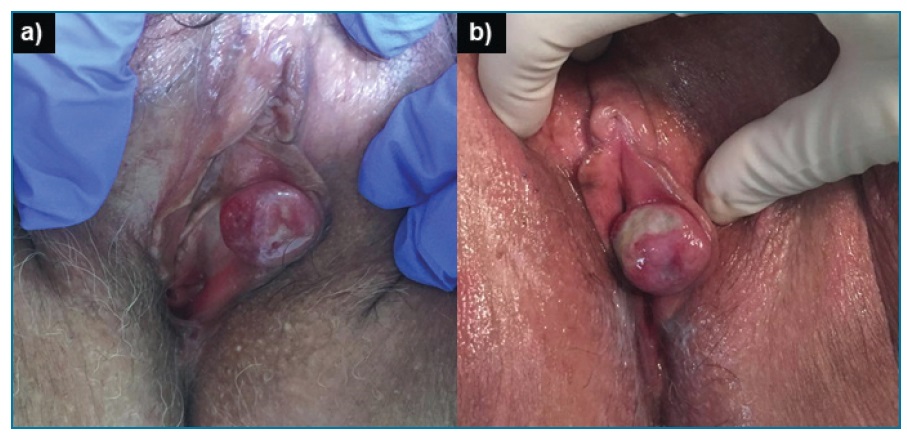 On gynaecological examination, a 2 cm unpigmented lesion was observed on the internal surface of the left hemivulva, at the left labia minora (Figure 1 a)). The lesion was lateral and had no relation with the urethral meatus. No macroscopic lesions were identified in the vaginal mucosa and vault. The lesion was interpreted as a benign cystic lesion, and was proposed for an excisional biopsy. On the day of the surgery, one month later, the lesion was slightly increased and ulcerated (Figure 1 b)). Histology revealed a vulvar malignant melanoma, epithelioid, with a maximal thickness of 1.9 cm; no signs of tumor lymphovascular invasion or satellite nodules were identified.