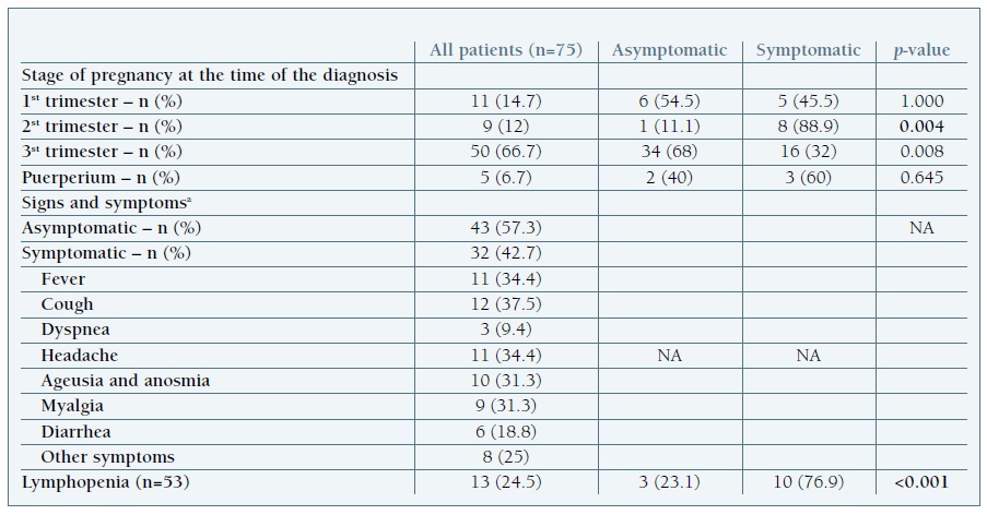 The majority of women were asymptomatic (57.3%) and tested upon hospital admission for labor or related to pregnancy complications. Five patients became symptomatic postpartum, 4 of them with an initial negative test for SARS-CoV-2. Among the 32 symptomatic women, most developed mild symptoms (Table II) including fever (34.4%), cough (37.7%) and headache (34.4%); other symptoms such as ageusia/anosmia (31.3%) and myalgia (31.3%) were also commonly described. Lymphopenia was present in 13 women, 10 of which were symptomatic (p<0.001).